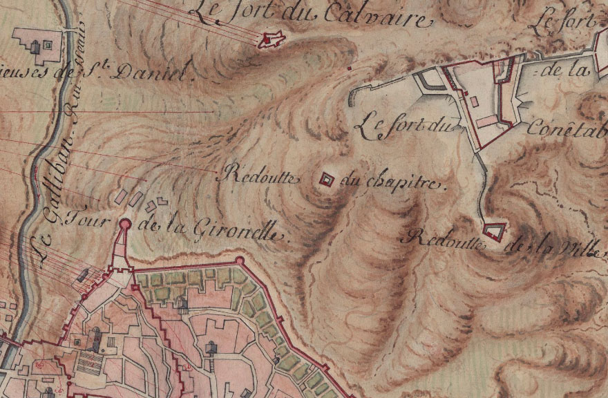 Aquest reducte (1), construït en el punt més elevat de l'actual barri de Torre Gironella, defensa avui desapareguda, formava part de la cadena defensiva dels turons de llevant de la ciutat. Construït el 1675, conjuntament amb els del Calvari i el de la Ciutat (aquest darrer des de 1874 "la torre d'Alfons XII"). Va cobrir una posició estratègica entre aquests dos forts i el del Condestable, i la seva relació amb la Torre Gironella, contrafort ja de l'emmurallat de Girona. ![]() (Ampliar) - Detall de "Girone, ville forte d'Espagne, de la province de Catalogne. Elle fut prise par l'Armée du roy dans la campagne de 1694". Bibliothèque Nationale de France.