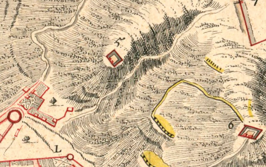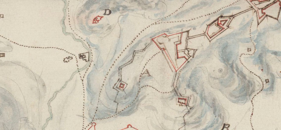Construït, com hem dit, el 1675, amb el nom original de "Fort dels Quatre Màrtirs", era d'arquitectura molt senzilla, tan sols era una posició destacada del proper fort del Condestable, i la seva missió era assegurar les comunicacions entre la ciutat i els forts de la muntanya, i ajudar en la defensa de la vall de Sant Daniel. ![]() (Ampliar) - Detall de "Plan de Gironne et de ses environs, dessiné par Louis Armand Paulmier". Ca. 1820. Bibliothèque nationale de France.