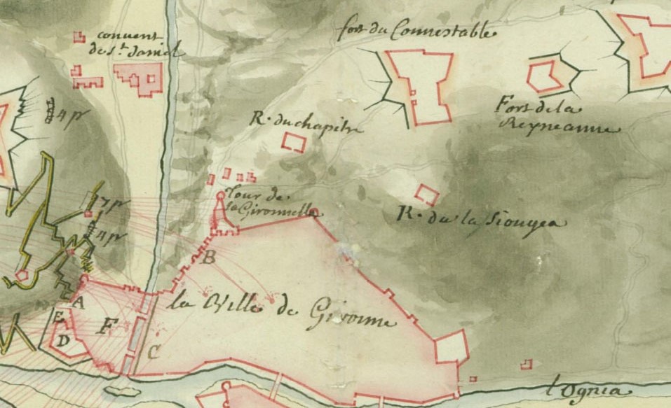 Durant la Guerra del Francès el reducte va tenir un paper important com enllaç entre les diverses defenses de les Pedreres. El 1814, amb la sortida de les tropes napoleòniques de la ciutat, va ser volat, com també altres forts. Tal com explica Joaquim Pla Cargol a l'article publicat a la Revista de Girona "La torre gerundense de Alfonso XII", "En 1814, cuando los napoleónicos evacuaron Gerona y se retiraron en dirección a Francia, procedieron a volar todos los fuertes de las Pedreras, y también la torre Gironella". ![]() (Ampliar) - Detall de "Gironne. Dessiné par A. Bertau". 1711. Bibliothèque Nationale de France.