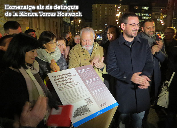 Síntesi: El dilluns 15 de gener 2024, l’Ajuntament de Girona i Comissions Obreres han homenatjat les sis persones que van ser detingudes fa 50 anys per organitzar unes de les primeres comissions obres de les comarques gironines a la fàbrica Torras Hostench de Sarrià de Ter. En memòria d’aquests treballadors, s’ha col·locat una placa a la Gran Via de Jaume I, davant per davant del que havia estat l’antic Govern Civil i que actualment és la Dependència Provincial de l’Àrea de Treball i Immigració de la Subdelegació del Govern espanyol a Girona. L'acte ha estat presidit per l’alcalde de Girona, Lluc Salellas, acompanyat per la secretària general de Comissions Obreres de Girona, Belén López Sánchez, i una de les persones detingudes, Xavier Corominas Mainegre.