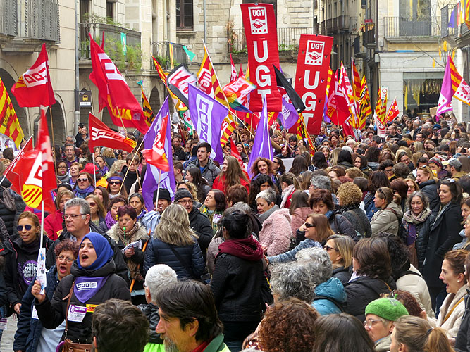 El dijous 8 de març de 2018 es va commemorar el Dia Internacional de la Dona, dia de vaga, es va iniciar amb una concentració i parlaments a la plaça del Vi. Els actes de la tarda es varen iniciar a les set de la tarda a la plaça de Vi on dones de la Colla Castellera Xoriguers de la UdG varen aixecar un castell, i amb lectures d'alguns textos escrits per dones que no podien ser-hi presents. La marxa, que segons la Policia Municipal va reunir unes 8.000 persones, va recorrer les principals artèries de la ciutat passant pel mercat del Lleó, el carrer Joan Maragall i per la Gran Via Jaume I fins a Correus. Després es va enfilar de nou per la plaça Independència i el carrer Santa Clara fins al punt de partida, la plaça del Vi.