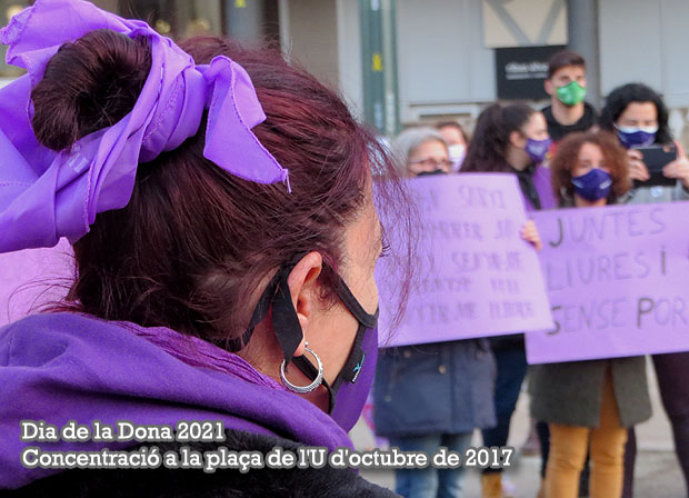 El vespre del dilluns 8 de març de 2021, per commemorar el Dia de la Dona, es va fer una concentració a la plaça de l'U d'octubre de 2017. Amb les distàncies aconsellades per la situació sanitària, es va dibuixar un símbol feminista a terra, que va ser resseguit pels manifestants amb pancartes liles. Tanmateix, s'hi varen llegir diversos manifests.
