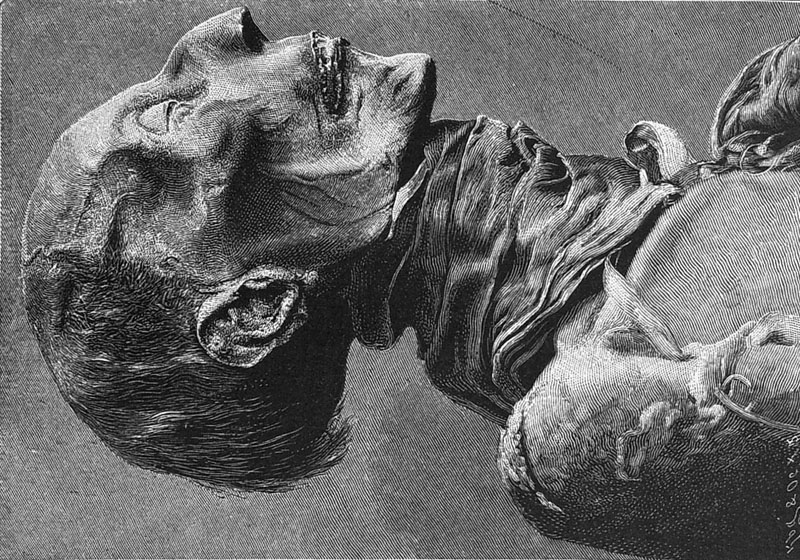 (Ampliar) - Cap de la mòmia de Ramesses II, dit el Gran, Ca. 1303-1213 aC. Gravat. 1880. Viquipèdia.