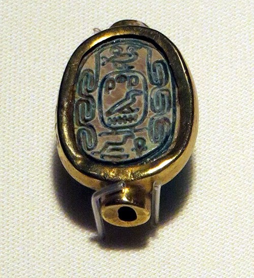 (Ampliar) - Anell amb escarabeu. Or i esteatita. Dinastia XXII, regnat de Sheshonq I, Ca. 945-924 aC.