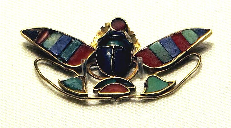 (Ampliar) - Ornament d'un escarabeu alat que subjecta un disc solar. Electre, lapislàtzuli, cornalina i feldespat. Dinastia XII, regnat de Senuseret II, Ca. 1880-1874 aC. |
