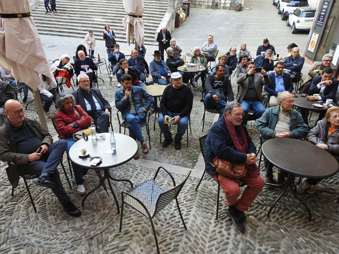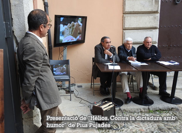 Síntesi: El dijous 13 d'abril 2023 en un acte a la plaça de la Catedral, a la terrasa del Bar l'Arc, es va presentar el llibre "Hèlios. Contra la dictadura amb humor" de Pius Pujades. L'acte, introduït per Daniel Bonaventura, va ser protagonitzat pel periodista Jordi Grau i Ramió, Antoni Bou, de la Fundació Atrium Artis, editora del llibre, i del mateix autor, Pius Pujades. El llibre, que compta amb una introducció de l’escriptor i cineasta afincat a París, Fernando Arrabal i prologat per el periodista Jordi Grau, és un recorregut per l’obra i la vida de fotògraf, ninotaire i periodista Jordi Soler, conegut com a Hèlios i autor de Sísif, la tira còmica del diari El Punt Avui. A les seves 428 pàgines, s’hi recullen centenars de dibuixos-acudits, molts dels quals van ser realitzats a la barra del bar L’Arc.