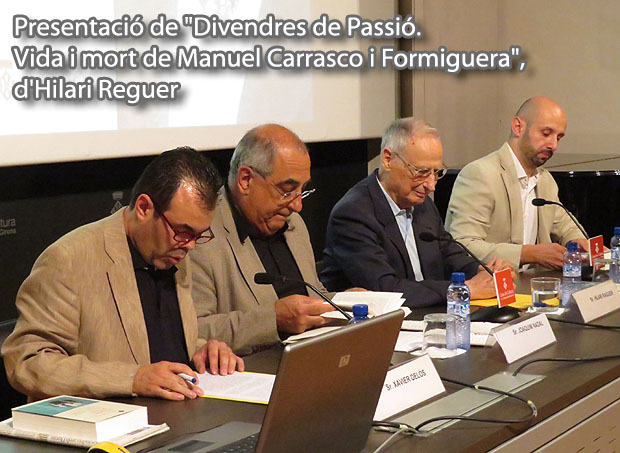 Síntesi: El divendres 9 de juliol 2015 va tenir lloc, a l'Aula Magna de la Casa de Cultura, la presentació de la reedició de "Divendres de Passió. Vida i mort de Manuel Carrasco i Formiguera", la biografia del cèlebre polític catalanista que va publicar el 1984 i que ara torna revisada i il·lustrada. A l'acte, organitzat per la Llibreria Geli, hi varen participar l'autor, el pare Hilari Raguer, monjo de Montserrat i historiador, Joaquim Nadal i Farreras, catedràtic d'història contemporània de la Universitat de Girona, i Jordi Bohigas i Maynegre, doctor en història per la Universitat de Girona, professor de l'Institut Superior de Ciències Religioses, i divulgador, a nivell gironí, de la figura de Carrasco i Formiguera.