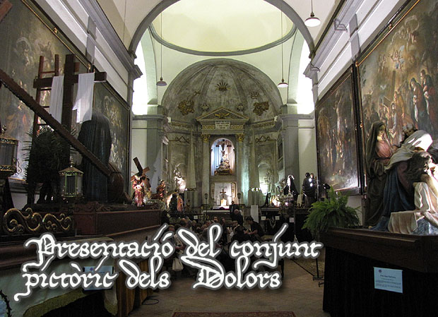 Síntesi: L'any 1998 es va iniciar el projecte de restauració del primer dels quadres penjats als laterals de la nau central de l'església de la Mare de Déu dels Dolors, La fugida a Egipte, que va ser presentat el 2002. El 2007 es va reprendre el projecte amb l'obra Jesús entre els Doctors, i l'any 2008 amb La presentació de Jesús al Temple. El 2010 es presentà el quadre L'enterrament de Crist. El 4 d'octubre de 2012 s'han presentat els dos quadres i La crucifixió, els darrers que restaven per restaurar del conjunt de sis que formen part dels Set Dolors de la Mare de Déu de l'esmentada església. La presentació ha anat seguida d'una conferència del doctor Francesc Miralpeix, professor de la UdG, i l'Equip de Restauració i Conservació del Centre de Restauració de Béns Mobles de la Generalitat de Catalunya.