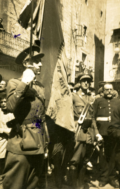 “Tres dies d’abril. 90 anys de la proclamació de la República” és una exposició itinerant que es va poder veure al Palau Robert de Barcelona des del 13 d’abril fins al 9 de maig i ara al Museu d’Història de Girona. ![]() (Ampliar) - Un moment de la proclamació de la II República Espanyola a la plaça del Vi de Girona. Militars durant l'acte. 1931. Autor desconegut. CRDI - Ajuntament de Girona.