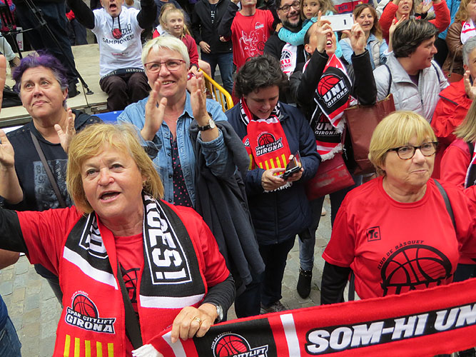 ![]() El dimarts 7 de maig de 2019 varen arribar a la plaça del Vi les jugadores, tècnics, directius i personal del club, després d'haver aconseguit el títol de Lliga. Allà els esperaven uns 300 aficionats, i van ser rebuts per l'alcaldessa Marta Madrenas, que els va entregar un obsequi commemoratiu. Tot seguit va arribar el moment més esperat: la sortida al balcó de l'Ajuntament per saludar els aficionats que s'estaven esperant a baix. ![]() (Ampliar) - Rebuda a l'Ajuntament. Al balcó van prendre la paraula Cayetano Perez, Èric Surís i jugadores com Rosó Buch, Núria Martínez, Laia Palau, Hampton, Júlia Reisingerova o Helena Oma. Ja al tram final dels parlaments es van sentir els càntics d'"alcaldessa, volem l'Eurolliga", de part de l'afició. La cançó "Human de The Killers", les jugadores ruixant l'afició amb cava i una gran pluja de serpentines blanques van posar punt final a la festa. ![]() (Ampliar) - Les jugadores al balcó de l'Ajuntament. ![]() (Ampliar) - L'afició a la plaça del Vi. |