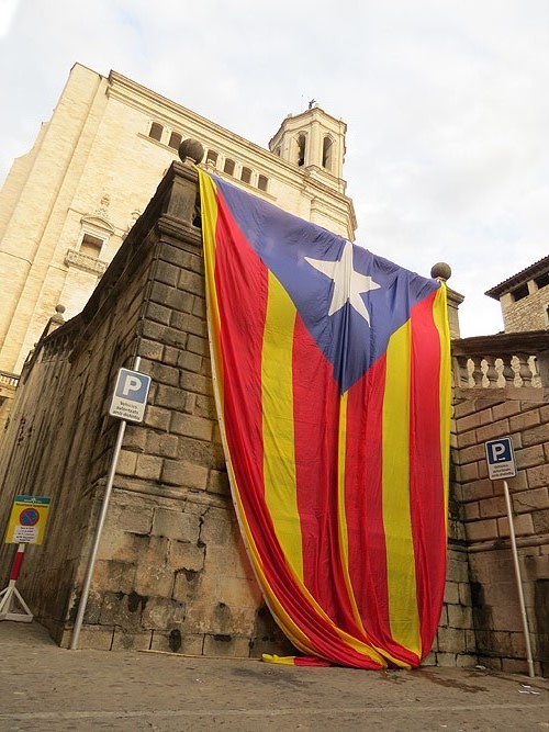 (Ampliar) - Desplegament de l'estelada al lateral de les escales de la Catedral. |