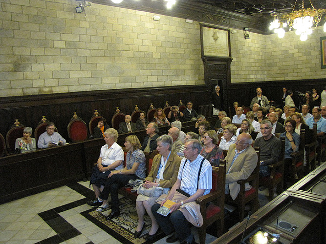 Aquest refugi es va construir l'any 1938. És de tipus cel·lular. Consta de dues entrades, connectades a través d'un passadís. La seva superfície és de 584,67 m² construïts, dels quals 357,86 m² són útils (passadís i escales inclosos) per tal de donar protecció a més de 700 persones. Aquest va ser l'únic refugi de la ciutat que disposava de llum elèctrica. ![]() (Ampliar) - El Saló de Plens durant la presentació.© Fèlix Xunclà/Assumpció Parés |