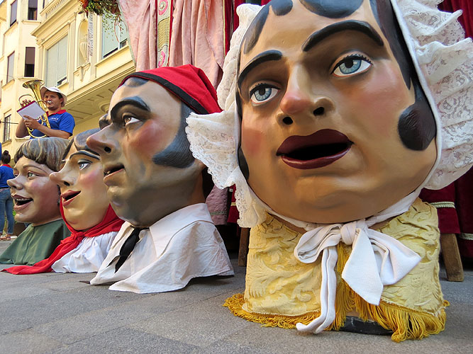 (Ampliar) - Els capgrossos de Girona, preparats per la cercavila.Els gegants de Girona. En Carlemany i l'Anna Gironella.