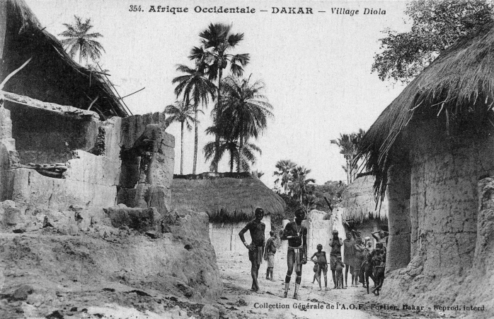 Poblat diola, Àfrica Occidental. Postal anterior a 1928. François-Edmond Fortier (1862-1928). Font: Wikipèdia.