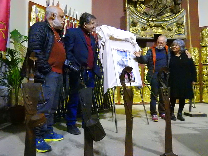(Ampliar) - Presentació del Cartell. D'esquerra a dreta: Àngel Almazan, co-autor del cartell; Xavier Serra, president dels Manaies; Jordi S. Carrera, co-autor del cartell, i Maria Teresa González v&iacuute;dua de Max Varés. [Més imatges]------------- |