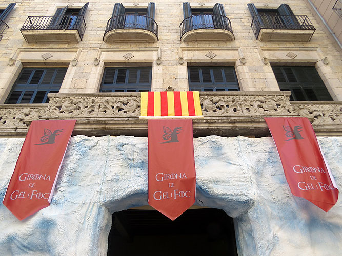 La façana de l'Ajuntament va ser decorada amb "El Mur", que donava la benvinguda als centenars de persones que al llarg de tot el dia es van acostar fins a la plaça del Vi per viure l'ambient de l'estrena. A l'entrada del consistori, un "Caminant Blanc" iniciava un seguit d'elements (escuts, banderes, mural amb els principals protagonistes de la sèrie), que anava conduïnt cap a la principal atracció, el "Tron de Ferro" on els assistents es va poder fer fotos. ![]() (Ampliar) - Girona amb drac. Fotografia d'Abraham Simon, grafisme de Joan Ayala, gentilesa dels autors. ![]() (Ampliar) - Un Caminant Blanc a l'entrada del Teatre Municipal. ![]() (Ampliar) - Una de les parades del Mercat Medieval a la plaça del Pallol. ![]() (Ampliar) - Façana de l'Ajuntament decorada amb El Mur. ![]() (Ampliar) - Públic esperant per fotografiar-se al Tron de Ferro. ![]() (Ampliar) - Rafel Nadal, Anna Payer, Joan Roca, Guillem Terribas i Josep Campmajor, davant l'Ajuntament. |