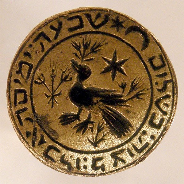 - Plat de Pésaj. Ceràmica decorada, segle XV. Còpia de l'original del Museu Nacional d'Israel. Museu d'Història dels Jueus.