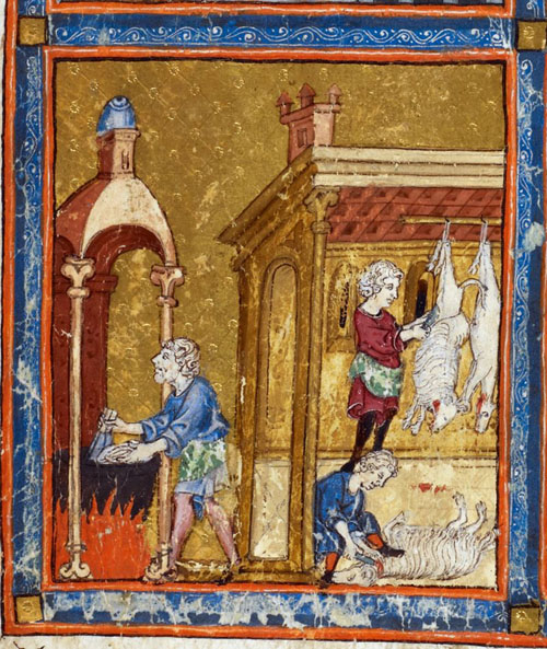 - Detall d'una miniatura del sacrifici dels xais de Pasqua i de la neteja (hagalat kelim), de la Hagadà Daurada, Barcelona, segona meitat del segle XIV. Viquipèdia.