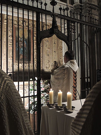 La Mare de Déu del Bell-Ull correspón a un culte popular molt arrelat a la ciutat en moltes èpoques. La capella, situada a l'angle oest de la galeria sud, és una antiga porta d'accés al claustre que va ser reformada en època gòtica. ![]() (Ampliar) - Un moment de la celebració.El 1904, el poeta Josep Carner trametia en una carta a la poeta mallorquina Maria Antònia Salvà, un poema de sis estrofes dedicat a l'obra escultòrica catedralícia, amb un títol llarg i prosaic: "A la Mare de Déu de Gràcia i de Bell-ull, que regna en el claustre de la catedral de Girona". Els versos fan així: "Amb la il·lusió plegada com una ala cansada, | ben nu de tota cosa del món, petjant l’orgull, | jo vull alçar la meva petita veu que plora | a la Mare de Déu de Gràcia i de Bell-ull". ![]() (Ampliar) - Un moment de la celebració. |