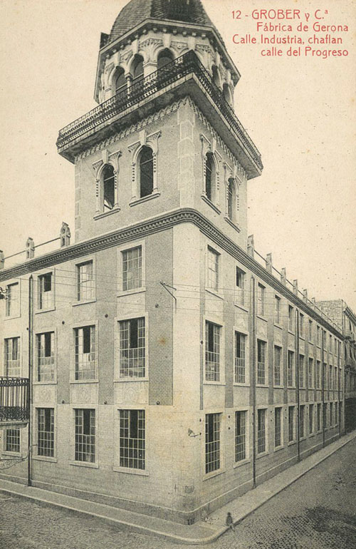 (Ampliar) - Façana de la fàbrica Grober a l'encreuament dels carrers Cristòfol Grober i Nou. 1910-1920. Autor desconegut. CRDI - Ajuntament de Girona.