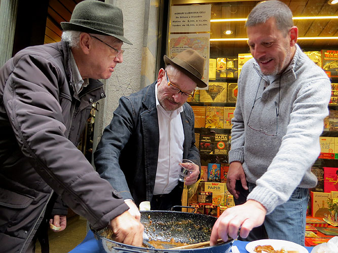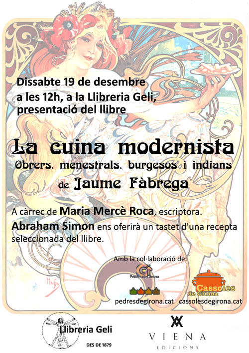 El dissabte 19 de desembre 2015 s'ha presentat a la Llibreria Geli de Girona el llibre "La cuina modernista. Obrers, menestrals, burgesos i indians" de Jaume Fàbrega. La presentació ha anat a càrrec de l'escriptora Maria Mercè Roca. ![]() (Ampliar) - L'autor Jaume Fàbrega amb el llibreter Pere Rodeja, durant la presentació.