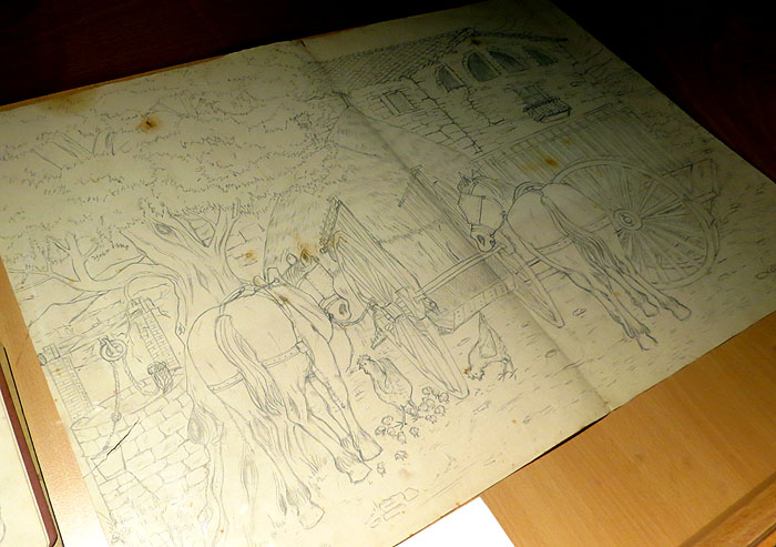 - Segant, 1963. Dibuix fet en viu que reflecteix un temps de sega a la seva vall, davant la Casota i Can Veí. A partir d'aquest dibuix va fer el quadre 'Segant el camp nou'.