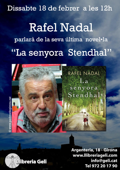 ![]() El dissabte 18 de febrer 2017 va tenir lloc una trobada a la Llibreria Geli amb Rafel Nadal Farreras, qui va explicar la seva última novel·la, "La senyora Stendhal", una història centrada en la postguerra i narrada amb ulls d'infant i, de retruc, en la guerra del 1936-1939, en la que es barregen records de l'autor i aportacions de protagonistes d'històries semblants a la narrada. ![]() (Ampliar) - Xavier Delòs i Rafel Nadal durant l'esdeveniment. Entre altres obres, Nadal (Girona, 1954), ha publicat "Quan érem feliços" (2012), novel&middor;la amb la que va guanyar el premi Josep Pla, una obra memorialística dels anys d’infantesa. La va seguir "Quan en dèiem xampany" (2013), novel·la centrada en la generació dels seus besavis, nissaga familiar vinculada a la indústria surera, a cavall de Cassà de la Selva i la Xampanya. El 2015 va publicar la novel·la menys vinculada a la seva història familiar, "La maledicció dels Palmisano", de gran èxit a Catalunya i que va ser traduïda a una dotzena de llengües. ![]() (Ampliar) - Rafel Nadal durant la xerrada. ![]() (Ampliar) - Llibreria Geli durant la xerrada de . |
