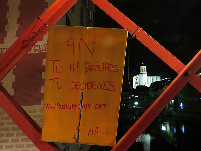 (Ampliar) - Cartell espontani al pont de les Peixateries Velles.A Girona hi havia un total de 77 meses dividides en set punts de participació: l'Institut Santiago Sobrequés (amb 7.955 vots), l'Institut Carles Rahola (amb 2.398 vots), l'Escola d´Hostaleria i Turisme de Girona (amb 5.948 vots), l'Institut Jaume Vicens Vives (amb 6.816 vots), l'Institut Montilivi (amb 3.286 vots), l'Institut Narcís Xifra (amb 3.241 vots) i l'Institut Santa Eugènia (amb 4.429 vots).