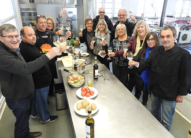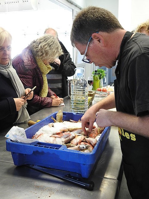 Amb una tria de peix fresquíssim que va aportar la Peixateria Serra del mateix Mercat del Lleó, la cuina es va situar al bell mig de l’aula i amb tots els assistents al seu voltant. Tots van participar en el cuinat de vàries cassoles de suquet, pelant i esqueixant patates, netejant peix, brandant l’all i oli, piconant el morter, remenant i afinant les cassoles al foc. Amb els ranxos fets tots els presents van poder tastar un plat de suquet i escurar les cassoles amb la coca que havia elaborat el pastisser David Diaz Cargol. La sessió va acabar amb un brindis amb cava gentilesa de Vins i Caves Diví.