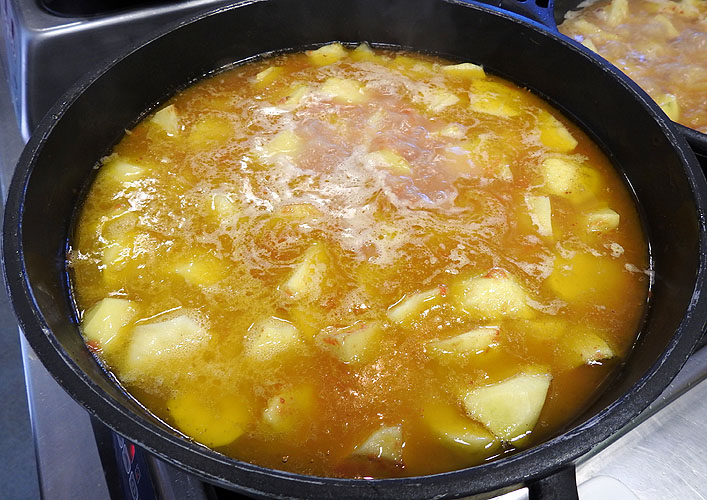 La cassola bombada o còncava de metall gruixut és l’estri més adequat per fer el suquet. També, la seva forma fa que necessiteu la menor quantitat de líquid possible per coure les patates. Si només teniu cassoles de fons pla perquè treballeu amb inducció, procureu que la seva mida s’avingui amb les patates que hi posarem, que hauran d’omplir tot el fons de la cassola per evitar haver-hi de posar més líquid del necessari i ens quedi un suquet aigualit.