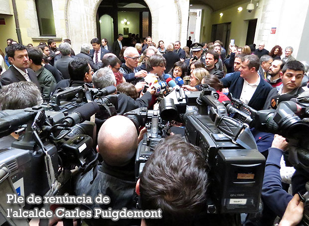 El dilluns 11 de gener 2016, va tenir lloc el Ple extraordinari de renúncia formal de Carles Puigdemont com alcalde de Girona, al Saló de Plens de l'Ajuntament. El dissabte dia 9 va ser nomenat candidat a la presidència de la Generalitat de Catalunya, i el diumenge dia 10 en va ser investit. L'entrada i la sortida de l'alcalde de la ciutat del Saló de Plens va convocar una multitut de mitjans de comunicació.