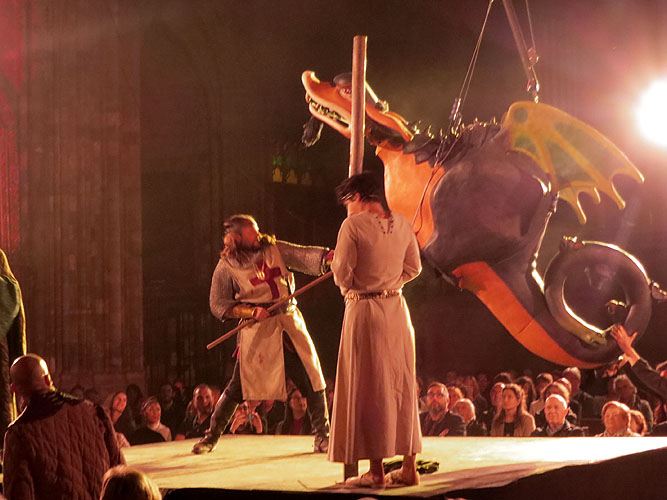 Representació de la "Consueta de Sant Jordi cavaller". Reportatge fotogràfic i article de la representació de l'obra teatral dirigida per Guillem Fernàndez-Valls, a la nau gòtica de la Catedral de Girona. |