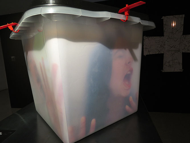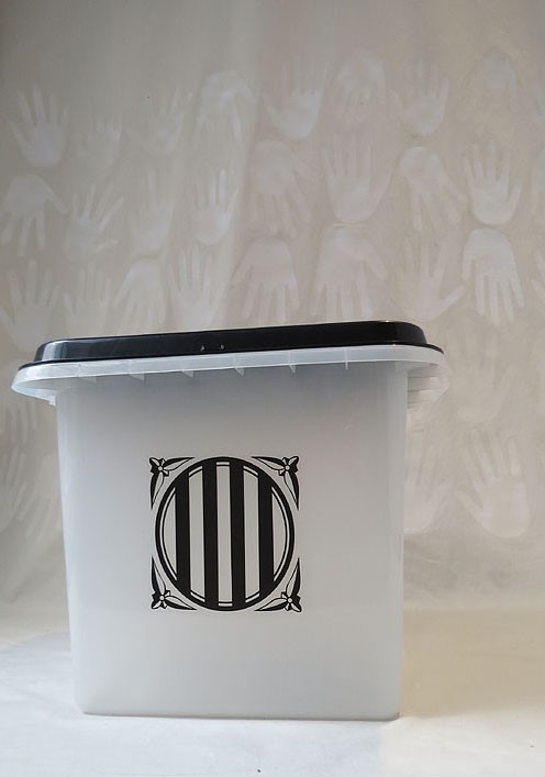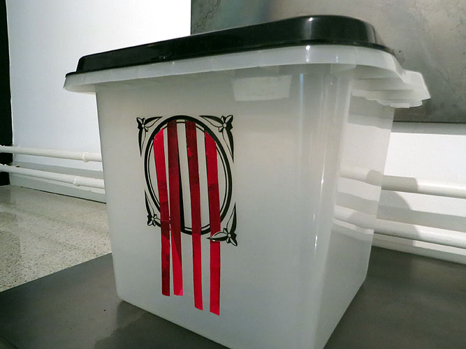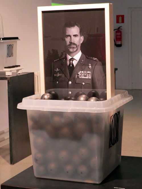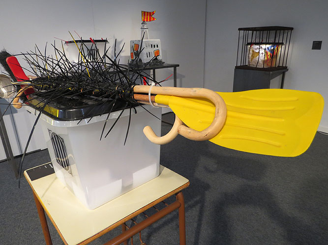(Ampliar) - Delphine Labedan. Democràcia perforada. Les urnes són el punt de partida de la mostra, promoguda pel Comitè de Solidaritat de Catalunya Nord. L’entitat va donar cinquanta-cinc urnes del referèndum a cinquanta-cinc artistes, que les han convertides en obres d’art per a reivindicar la llibertat. Partint d’aquest mateix material comú, l’urna del primer d’octubre, cada artista ha volgut exposar la seva visió sobre què va significar aquell dia. La mostra s'ha completat amb un un fotoreportatge de Georges Bartoli que relata els fets occoreguts a Barcelona entre el 20 de setembre i el 27 d'octubre del 2017.
