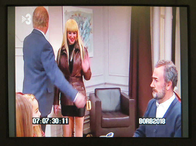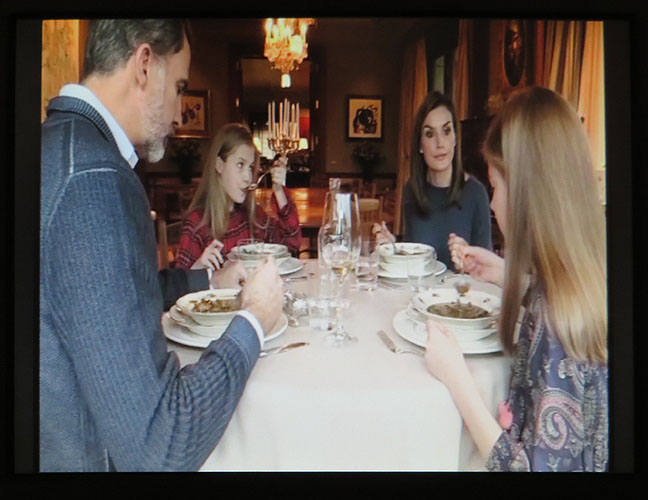 (Ampliar) - Joan Fontcuberta. Factum/Fictum. Després de la brutal repressió del referèndum de l'1 d'octubre Felip de Borbó va pronunciar un discurs que molts analistes van interpretar en clau freudiana d'"assassinar el pare", desempallegar-se de l'ombra del seu pare i mentor que l'havia entronitzat institucionalment quan va rebutjar l'intent de cop d'estat del 23-F. Però si l'actitud de Joan Carles va ser elogiada de forma unànime com una ferma defensa de la democràcia, la maldestre actuació del fill va ser molt criticada a Catalunya i als àmbits internacionals. Per polir-ne la imatge, la cadena pública TVE va aprofitar l'avinentesa del 50è aniversari del rei per dedicar un capítol monogràfic del programa "Informe Semanal" (emès el 28 de gener de 2018) a defensar aquella actuació. Per apropar la figura del monarca al espectadors i presentar-la de forma més "humana", el reportatge incorporava seqüències de la família reial. Es feia constar que aquestes imatges havien estat facilitades per la mateixa Casa Real i no enregistrades pels professionals del programa. El programa d'humor Polò:nia de TV3 va fer la rèplica d'una de les escenes, en la qual els pares i les filles conversen asseguts a la taula del menjador. La comparació de les dues versions, l'original i la paròdia, permet identificar fins a quin punt la realitat i la ficció es confonen. Al fals documental les accions volen semblar naturals, com copsades per una càmera oculta, però el resultat és una posada en escena de personatges encartonats que segueixen un guió artificiós. A la versió satírica la impostura no es dissimula i permet exagerar veritats afilades que l'humor fa més passables. Ho deia Picasso: l'art és una mentida que revela la veritat.