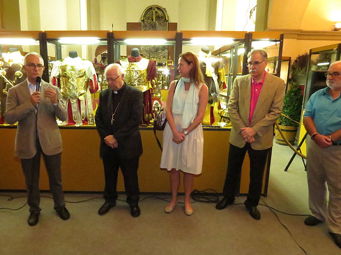 (Ampliar) - Vitrines de l'exposició. En primer terme, retallables de Jordi Pericot i Max VarésLa inauguració va ser presidida pel bisbe de Girona, Francesc Pardo, la regidora d'Empresa i Ocupació, Marta Madrenas, en representació de l'alcalde de la ciutat, el president de la Confraria de Jesús Crucificat- Manaies de Girona, Narcís Reixach i Blanch i el comissari de l'exposició, Pere Masferrer.