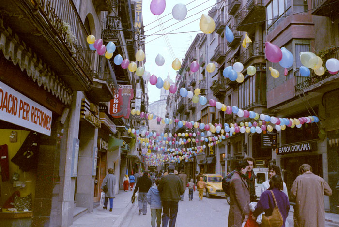 Decoració de Carnestoltes al carrer Argenteria a càrrec de l'Associació de Comerciants de la Rambla i el carrer Argenteria. 1986. Juli Torres Monsó. CRDI - Ajuntament de Girona - (Ampliar)