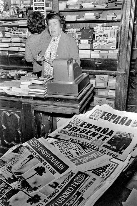 Venda de premsa a la llibreria Franquet, al carrer Argenteria. Al centre, la quiosquera, Maria Bosch. 1971. Narcís Sans Prats. CRDI - Ajuntament de Girona - (Ampliar)