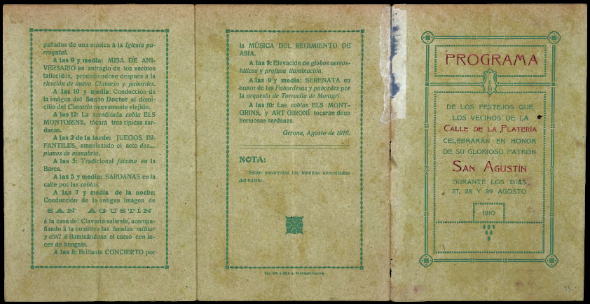 Programa de Festes de Sant Agustí dels veïns del carrer Argenteria de Girona durant els dies 27, 28 i 29 d'agost de 1910. Fons Ajuntament de Girona - (Ampliar)