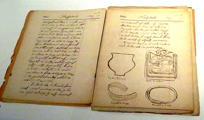 (Ampliar) - Diari manuscrit d'Emili Gandia del dia 15 de desembre de 1936, on explica les vicissituds de la col·locació de les bateries de costa per part de l'exèrcit i la instal·lació de la línea de telèfon i de la caseta d'observació, i comandament i en fa un dibuix de situació. MAC Empúries.