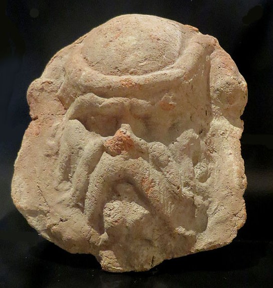 (Ampliar) - Antefixa de terra cuita en forma de cap de sàtir d'edificis de culte de la Neàpolis d'Empúries. Segles II-I aC. Trobat durant les excavacions realitzades per la Junta de Museus i posteriorment per l'Institut d'Estudis Catalans.