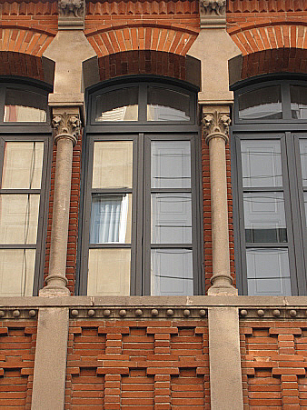 Detall de la façana de l'escola Joan Bruguera al carrer dels Artillers