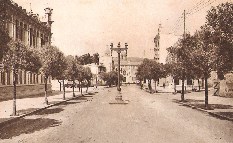 (Ampliar) - Imatge de la Gran Via de Jaume I. A l'esquerra, l'escola Bruguera i l'actual carrer dels Artillers. Postal antiga, col·lecció particular, Girona