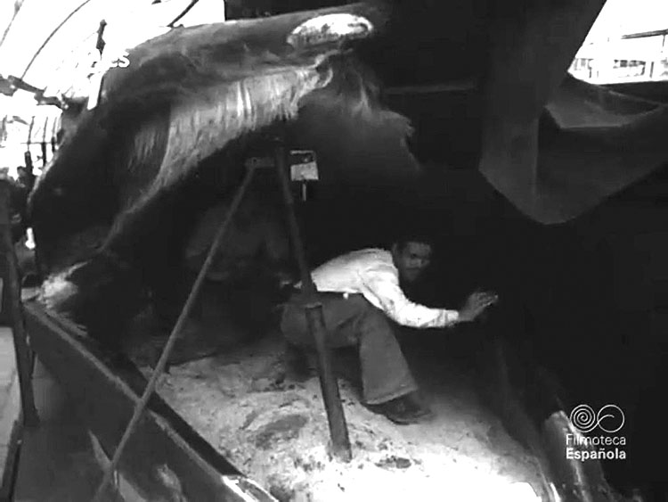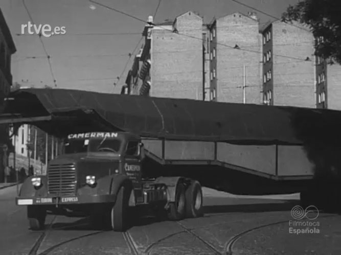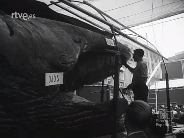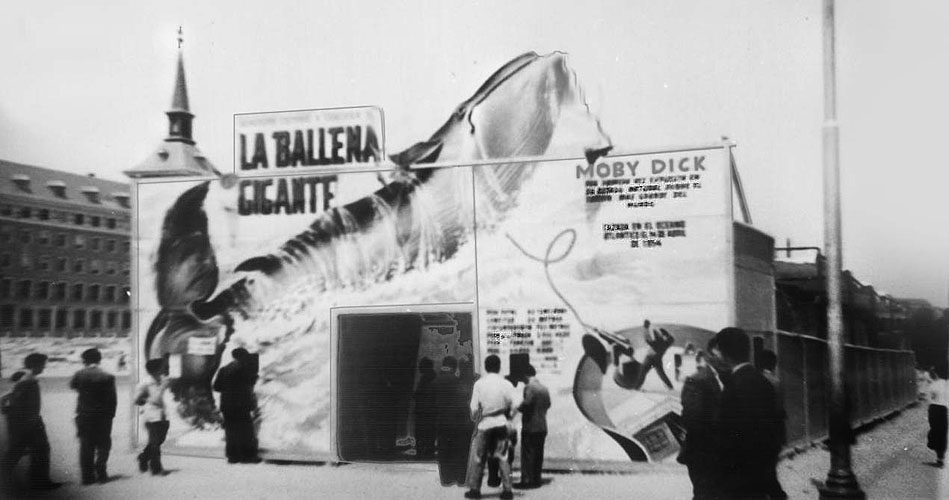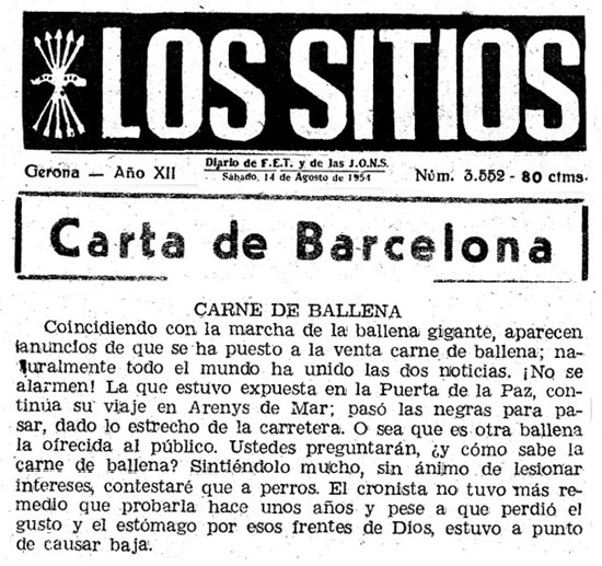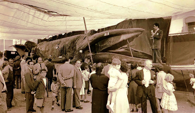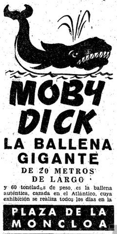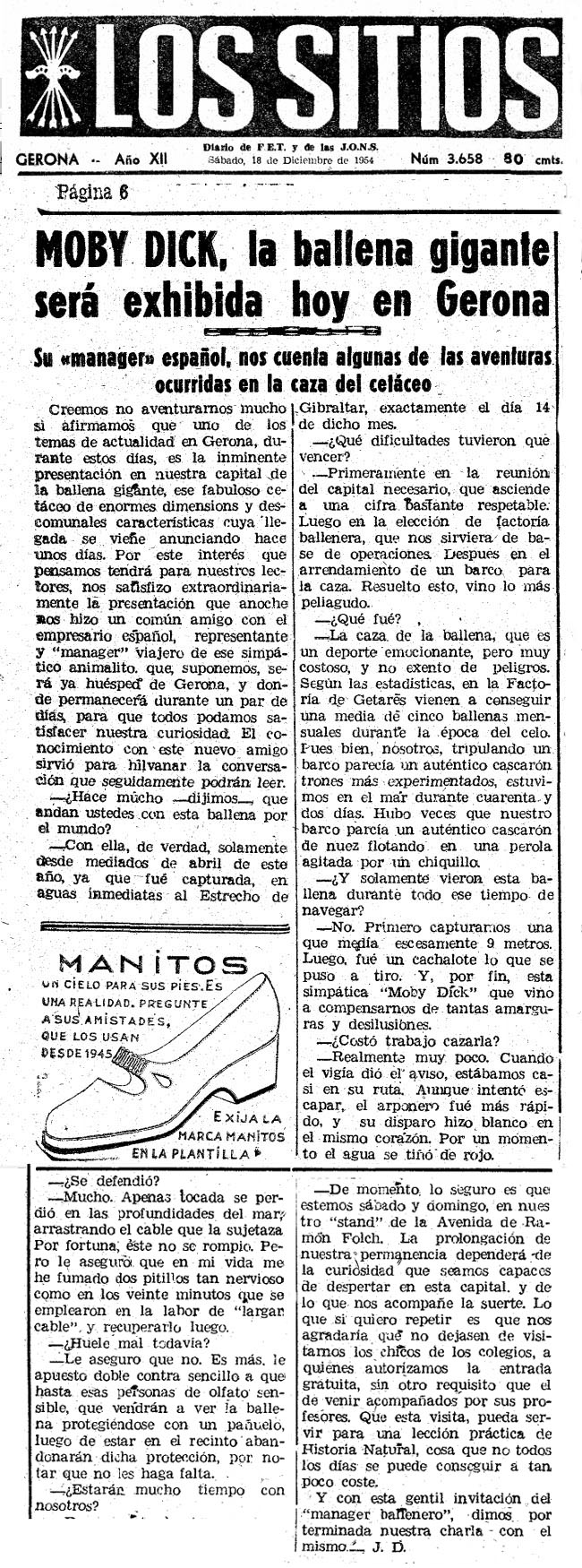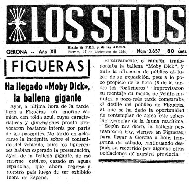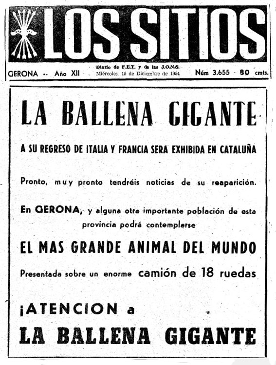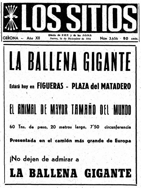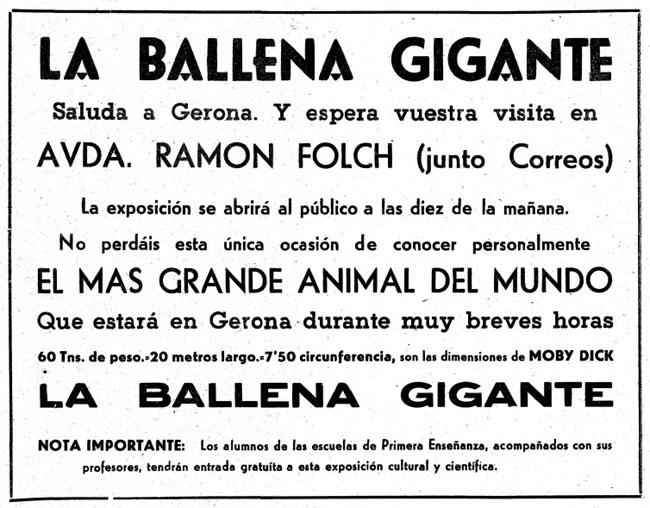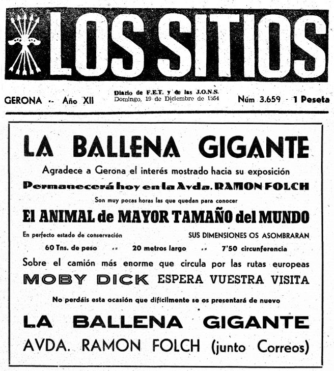 ![]() Els dies 18 i 19 de desembre de 1954, s'exhibia a l'avinguda Ramon Folch, davant l'edifici de Correus, una balena de 20 metres de llargada, 7,5 de circumferència i un pes de 60 tones, que havia estat capturada el 14 d'abril a l'Atlàntic. Arribava a Girona des de Figueres, on havia estat presentada a la plaça de l'Escorxador. La premsa de l'època anunciava que seria exposada com atracció de fira a mitja Europa i a Amèrica del Sud. A la publicitat s'indica que l'entrada seria de franc per als alumnes de les escoles gironines de Primària, acompanyats dels seus professors "a esta exposición cultural y científica". ![]() (Ampliar) - La balena dins la carpa d'exhibició, a Saragossa. Fotografia que venia el promotor de l'exhibició. El 14 de abril de 1954, una tripulació de 13 hombres capturava la balena. Segons unes fonts periodístiques, la captura es va fer amb la intenció d'exhibir-la cobrant entrada com una atracció de fira, i segons altres, la idea de treure'n per aquest mitjà el màxim rendiment econòmic se'ls va ocórrer posteriorment al veure les dimensions de l'animal. La qüestió era presentar-la amb l'espectacularitat mediàtica més gran possible. ![]() (Ampliar) - Article del diari 'Los Sitios' sobre el consum de carn de balena a Barcelona, del 14 d'agost de 1954. La balena va ser descarregada a Algeciras amb l'ajuda d'una grua portada a propòsit des de Gibraltar, grua que va volcar degut al pes de l'animal, i va començar la seva gira per tota Espanya. A Madrid va arribar el 13 de juny i es va exhibir en una carpa a la plaça de la Moncloa, on va ser portada amb un tràiler de 19 ruedas, "el camión más grande del mundo", com deia la publicitat. És de suposar que entre la calor, l'olor de l'animal en descomposició i els productes químics per evitar-ho, devien fer la visita ben breu. Per fer l'exhibició més atractiva, la balena va ser batejada com Moby Dick. ![]() (Ampliar) - El camió que transportava la balena. Fotograma del documental "Pintoresco y extraño" de NO-DO. "Moby Dick; por primera vez expuesta en su estado natural sobre el camión más grande del mundo", anunciava un cartell de la carpa, i per entrar-hi s'havien de pagar 2 pessetes. A l'interior hi havia la balena damunt el camió amb rètols que indicaven on hi havia els ulls, les aletes, les barbes, i es podia entrar dins el cos (els més valents). A Madrid hi va ser exposada dues setmanes, i fins i tot el NO-Do se'n va fer ressó, amb un documental titulat "Pintoresco y extraño". ![]() (Ampliar) - La carpa on s'exhibia la balena a Madrid, a la plaça de la Moncloa. Devia ser la mateixa que va arribar a Girona.