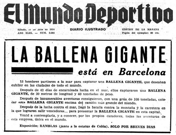 Seguidament va viatjar a Sant Sebastià, Pamplona i Saragossa on la varen exposar uns dies, i després aniria a Barcelona fins el 4 de agosto, on la varen exhibir al costat de l'estàtua de Colom, i va seguir cap Arenys de Mar. Probablement, d'aqui seguiria viatge a França i Itàlia, segons la publicitat dels diaris de l'època, i tornaria per ser visitada a diverses poblacions gironines (Girona, Figueres, Ripoll el 21 de desembre). ![]() (Ampliar) - Anunci de 'El Mundo Deportivo' del 17 de juliol de 1954, que informa de la presència de la balena a Barcelona. A partir d'aquest moment, la única referècia documental que hem localitzat del seu periple és el diari "El Ripollès" de l'U de gener de 1955, on s'informa que després de la visita a aquesta població de Ripoll el 21 de desembre de 1954, la balena iniciava una gira per Itàlia, Suïssa, Alemanya, Bèlgica i Holanda, on seria embarcada a Amsterdam per fer una altra tournée de tres mesos per diversos països d'Amèrica del Sud, gires que sembla no es varen dur a terme, atès que el 26 de febrer de 1955 estava a Granada, on va ser instal·lada a la plaça de Bibataubín. ![]() (Ampliar) - Un operari preparant la balena a la carpa d'exhibició. Fotograma del documental "Pintoresco y extraño" de NO-DO. ![]() (Ampliar) - Anunci de l'exhibició de la balena a Girona. ![]() (Ampliar) - Uns operaris preparant la balena a la carpa d'exhibició. Fotograma del documental "Pintoresco y extraño" de NO-DO. |