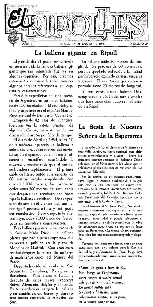 (Ampliar) - Article del diari 'El Ripollès', de l'U de gener de 1955, informant de l'exhibició de la balena a Ripoll, i de la gira que es proposava iniciar.