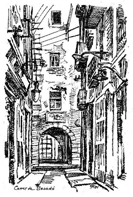 (Ampliar) - El carrer Besadó. Dibuix publicat a l'article "Mosaic topogràfic" de Jaume Marquès, al diari "Los Sitios de Gerona", 1/4/1979.