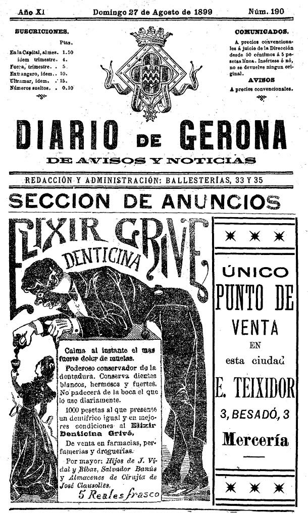 (Ampliar) - Anunci publicat al 'Diario de Gerona de avisos y notícias' el 27/8/1899.