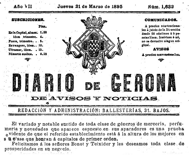 El 'Diario de Gerona de avisos y notícias' del 21/3/1895 dona la notícia de l'obertura de Ca'n Teixidor. L'establiment va tancar el 15/12/2012 - (Ampliar)