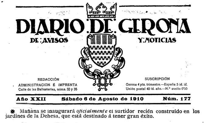 El "Diario de Gerona de avisos y notícias" del 3/5/1913 informava que "Son varias las personas que paseando por el jardín de la Dehesa han experimentado el hedor que despide el agaa del famoso surtidor y nos lo han advertido.