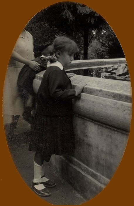 (Ampliar) - Montserrat Farreras, acompanyada per una dona i un infant, al Brollador dels jardins de la Devesa. 1930. Ferran Fons Navarro. CRDI - Ajuntament de Girona.